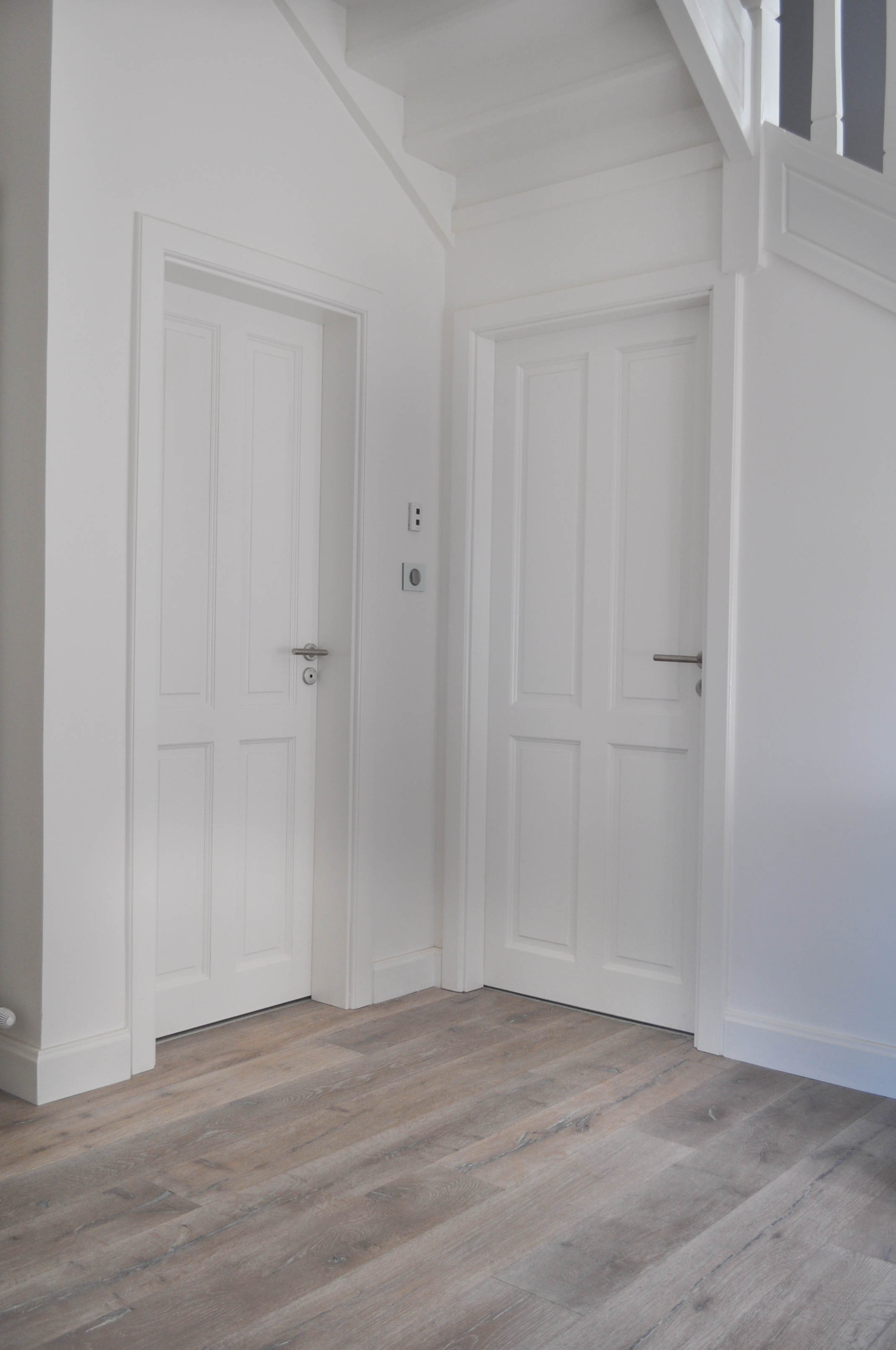 Pose de dix portes massives à panneaux sur chambranle et contre chambranle finition peinture blanche.
