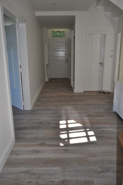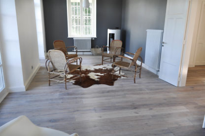 Pose de parquet contrecollé avec parements chêne vieilli gris dans le salon, l'entrée, le séjour et la cuisine. Les plinthes sont moulurées avec une finition à la peinture blanche.